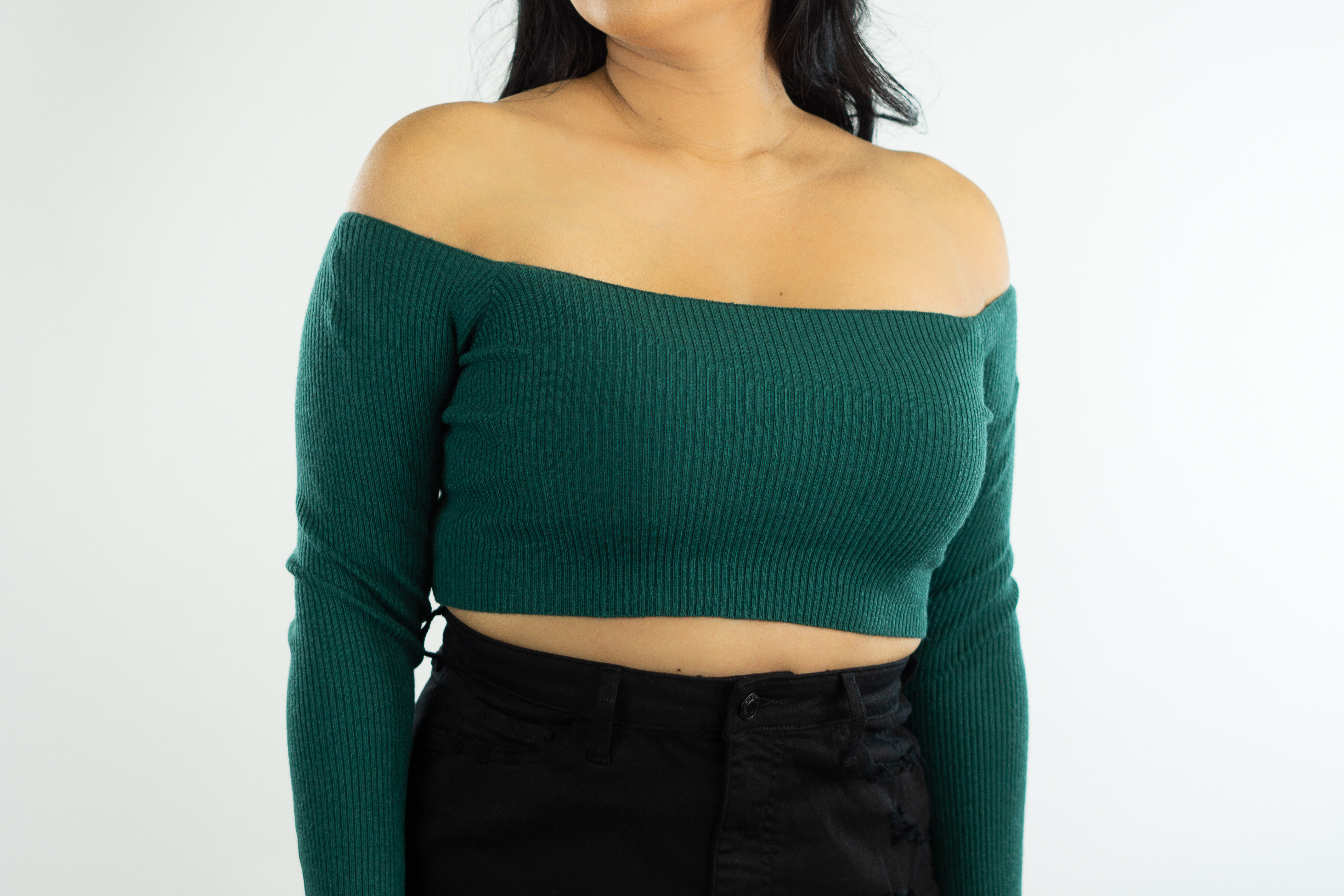 GREEN CROP TOP, OFF THE SHOULDER, LONG SLEEVE