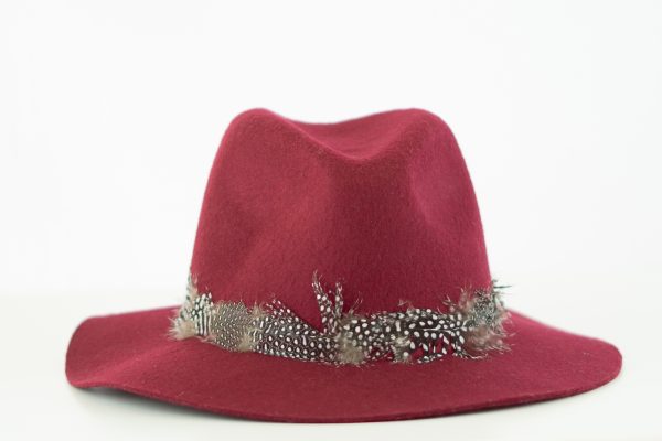 THE PERFECT FALL LOOK. BURGUNDY FAUX FEATHERS AROUND HAT